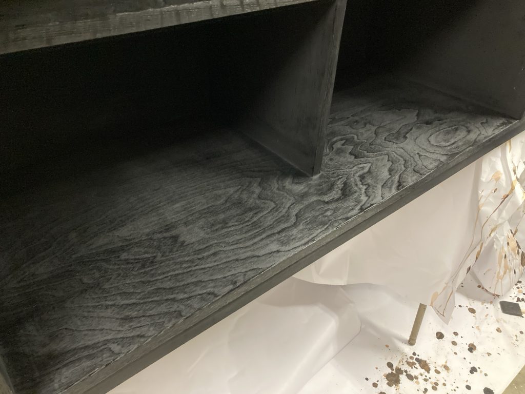 So I snagged some red oak and milled it all down into thin strips. The main body of the cabinet is plywood, with red oak doors. Ebonising was completely new territory for me, so naturally I made my own rust solution using vinegar and steel wool, then followed it up with that bark tea stuff… which I had to order from a taxidermy supply store. Very normal behaviour.