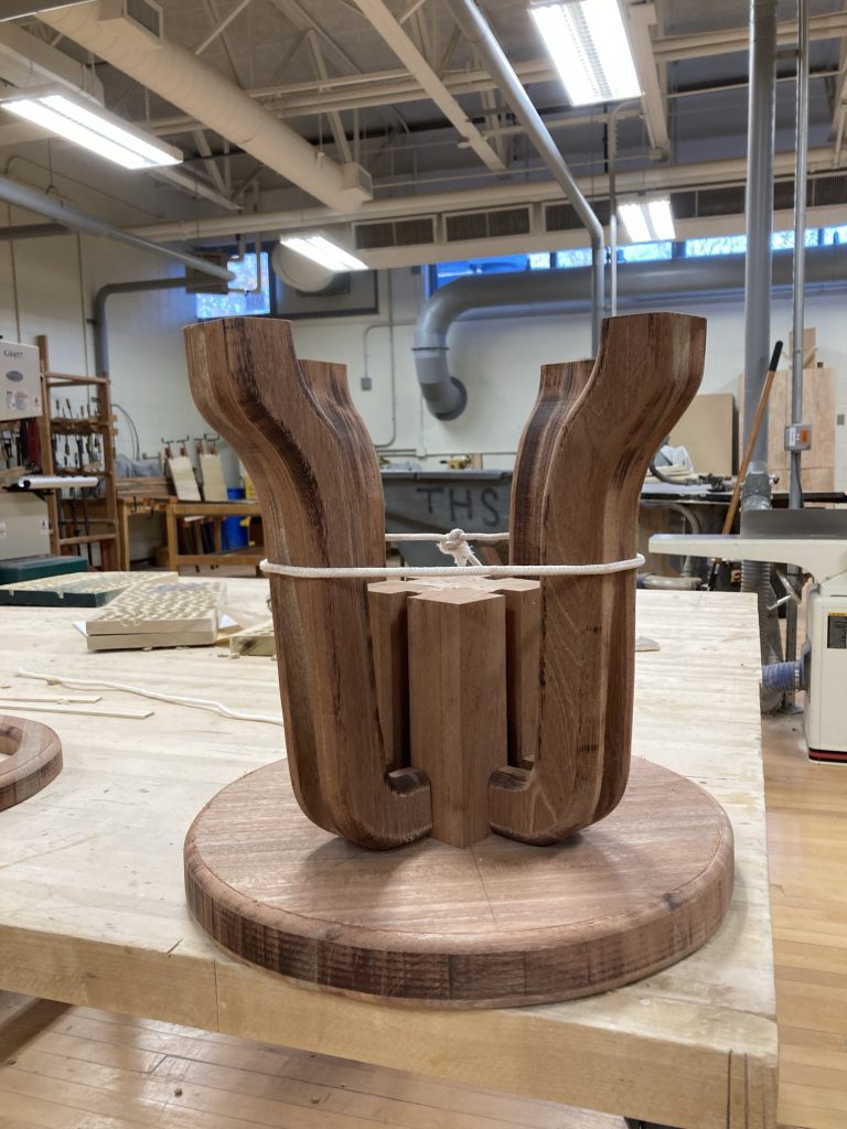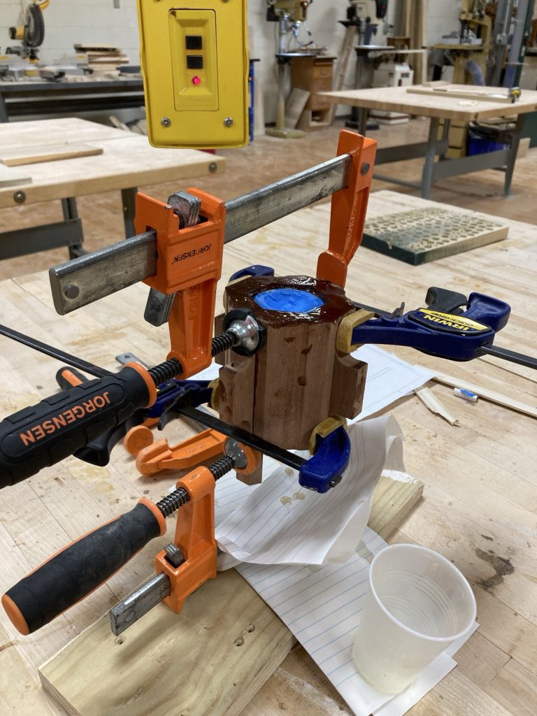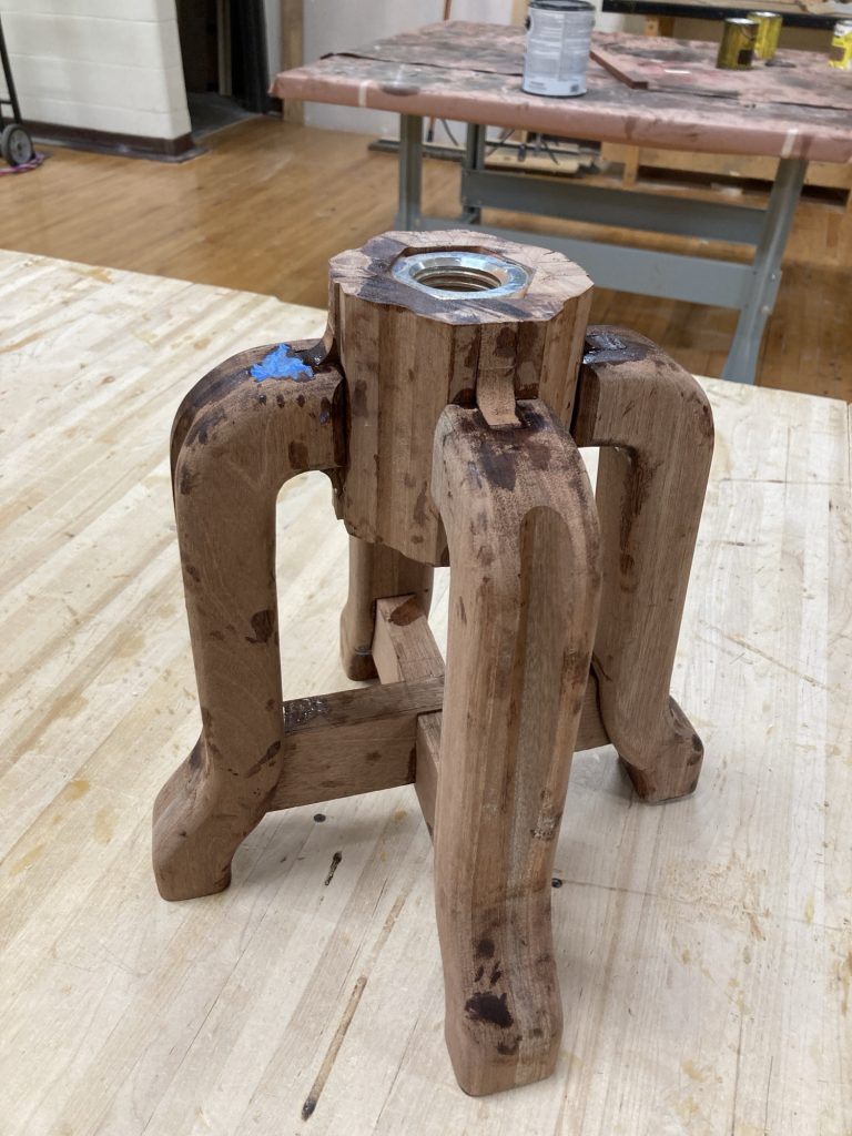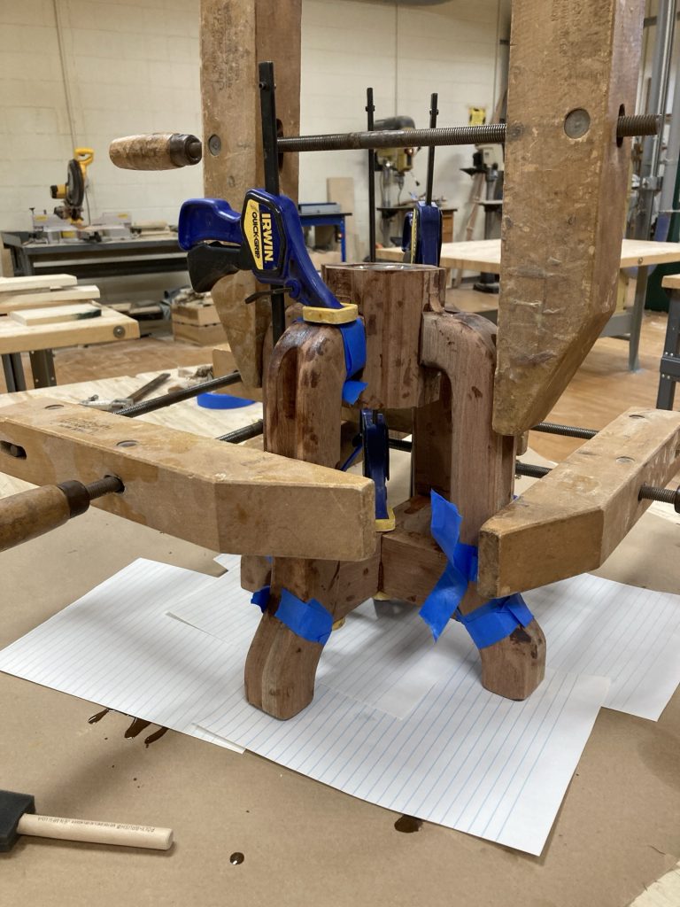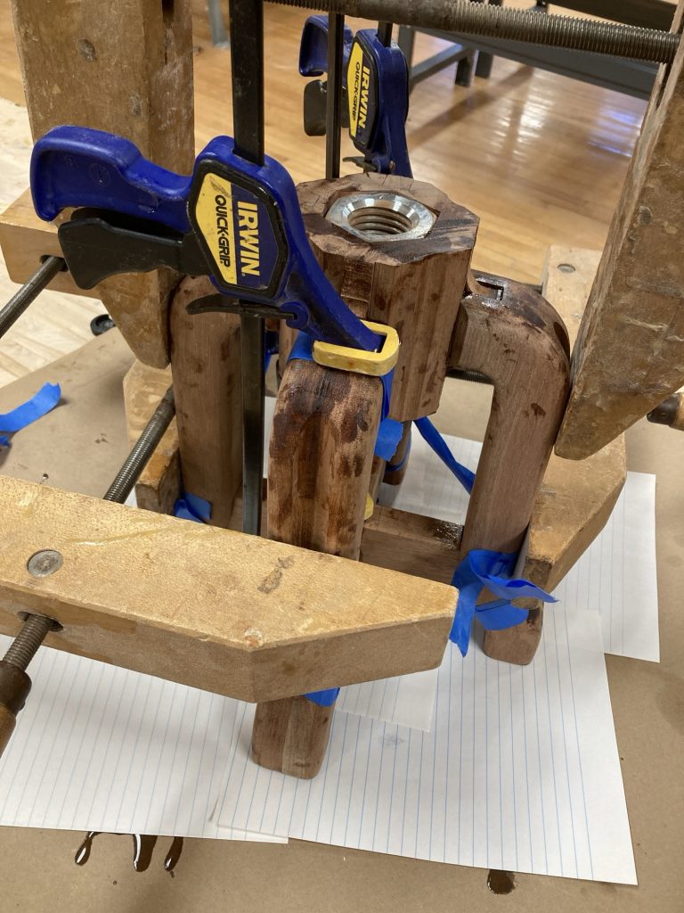 Then came the glue-up. I used epoxy. Structurally excellent. Emotionally chaotic. The mahogany absolutely drank the stuff, I was not as careful as I should’ve been, and everything got very sticky very fast. After a shit-ton of sanding, the legs came out great.