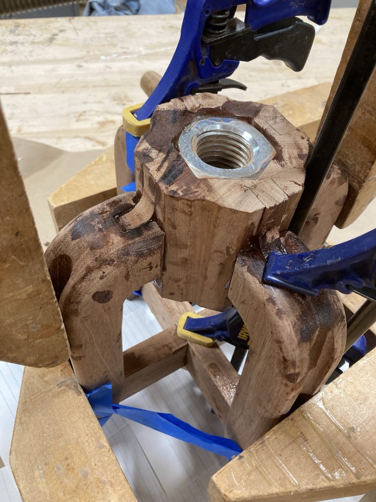 The central piece is a hexagonal block, which houses a stupid-thick threaded rod. Like… wildly over-engineered. I inset a massive nut into the centre with epoxy to support it, because apparently subtlety is not my thing.