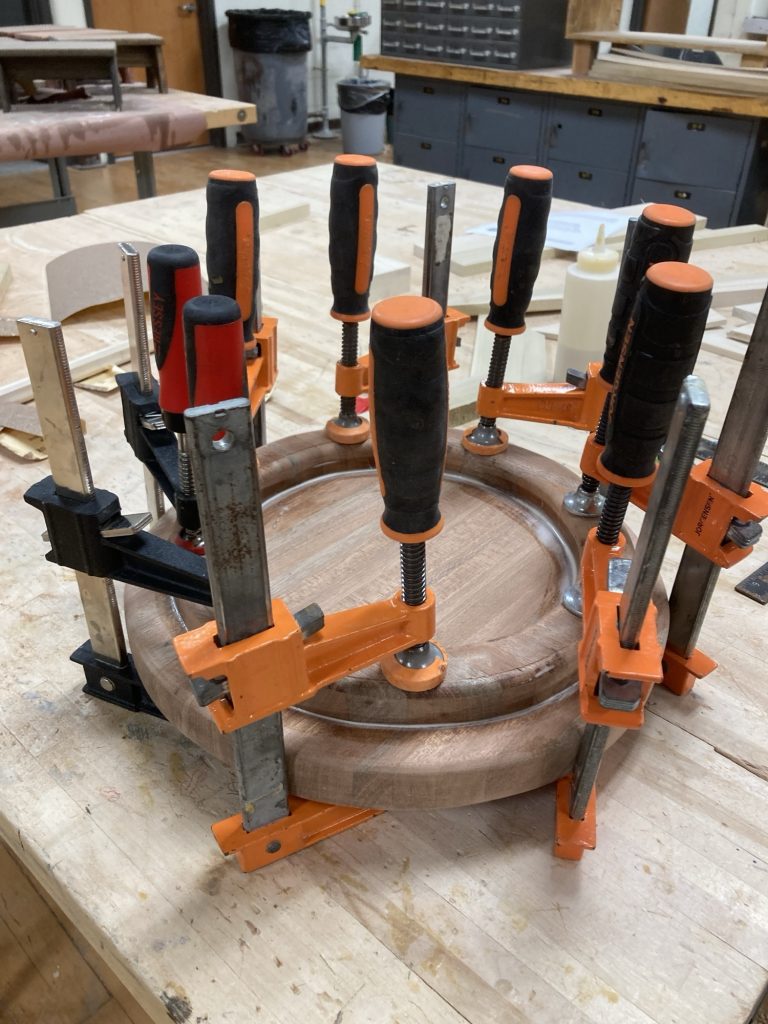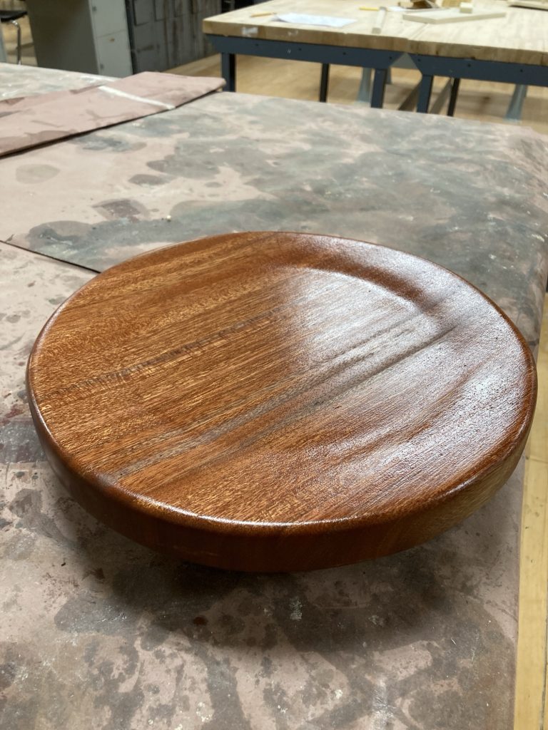 The seat I made super wide, about 14 inches round, because pottery sessions are long and comfort matters. I added a small lip to the underside of the seat to hide the steel flange I had welded onto the threaded rod. Bit more epoxy here, another aggressive sanding session there, and suddenly we were ready for finish.
